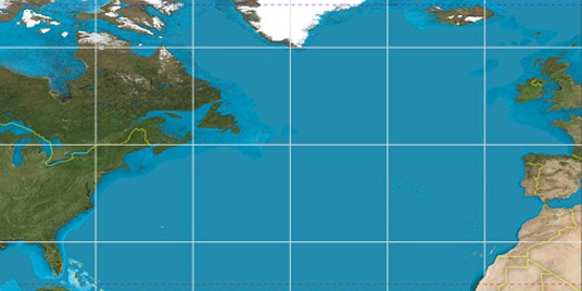 Step for grid lines is 15°. On second map 45° latitude and -60° longitude line is numbered. Map pointer shows the 46.14, -60.18 lat-long coordinates.