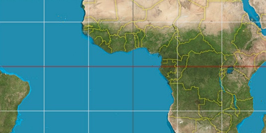 Step for grid lines is 15°. On second map 0° latitude and -0° longitude line is numbered. Map pointer shows the 5.31, -4.01 lat-long coordinates.