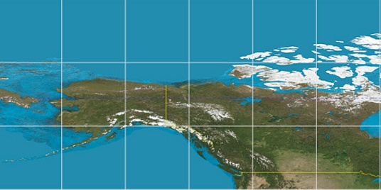 Step for grid lines is 15°. On second map 60° latitude and -135° longitude line is numbered. Map pointer shows the 57.05, -135.33 lat-long coordinates.