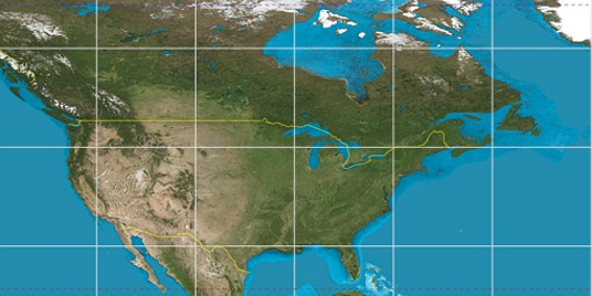 Step for grid lines is 15°. On second map 45° latitude and -75° longitude line is numbered. Map pointer shows the 40.56, -74.28 lat-long coordinates.
